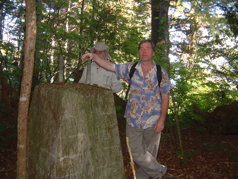 Two members of the CDSG next to one of four supports for the 75 foot steel tower. |