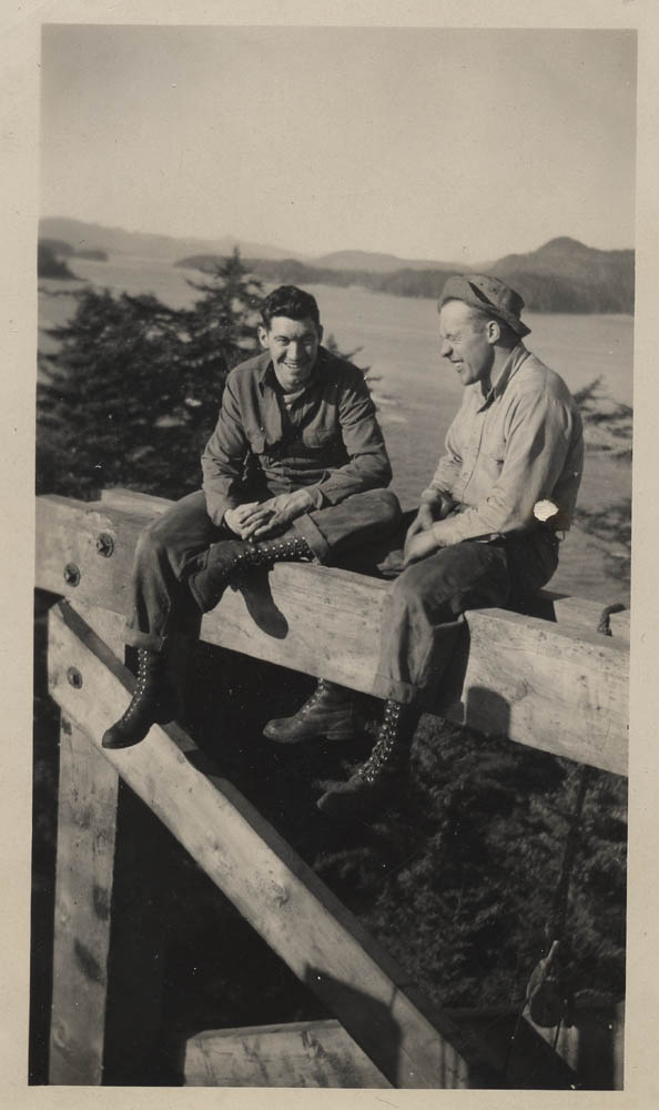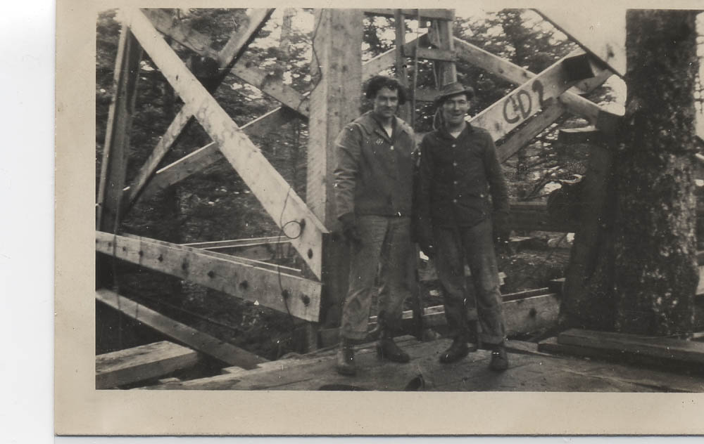 7369 - Two men on top of the incomplete B1S1 timber tower on Clam Island |