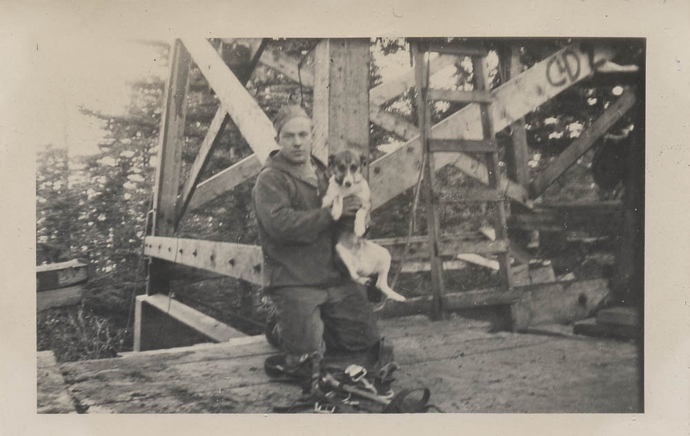 7353 - A soldier and his dog at the base of the timber B1S1 tower on Clam Island |