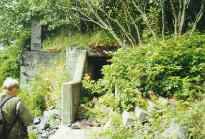 | was cancelled in 1944 a MET station was built on Sasedni Island instead. On the northwest side of the island there is a 30-foot concrete slab with four five-bolt rings. This was a 4-gun 20mm AA emplacement. The Navy gave the Army a few dozen 20mm guns to use in the defenses of the Navy Air Station. Signs of at least three other 20mm positions remain on the causeway. (One gun is located at the eroded section of the causeway joining Sasedni and Kirushkin Islands, and two are located on Makhnati Island, one in front of 292 gun No. 1, and the other in the gulley behind 155mm gun No. 4.) |