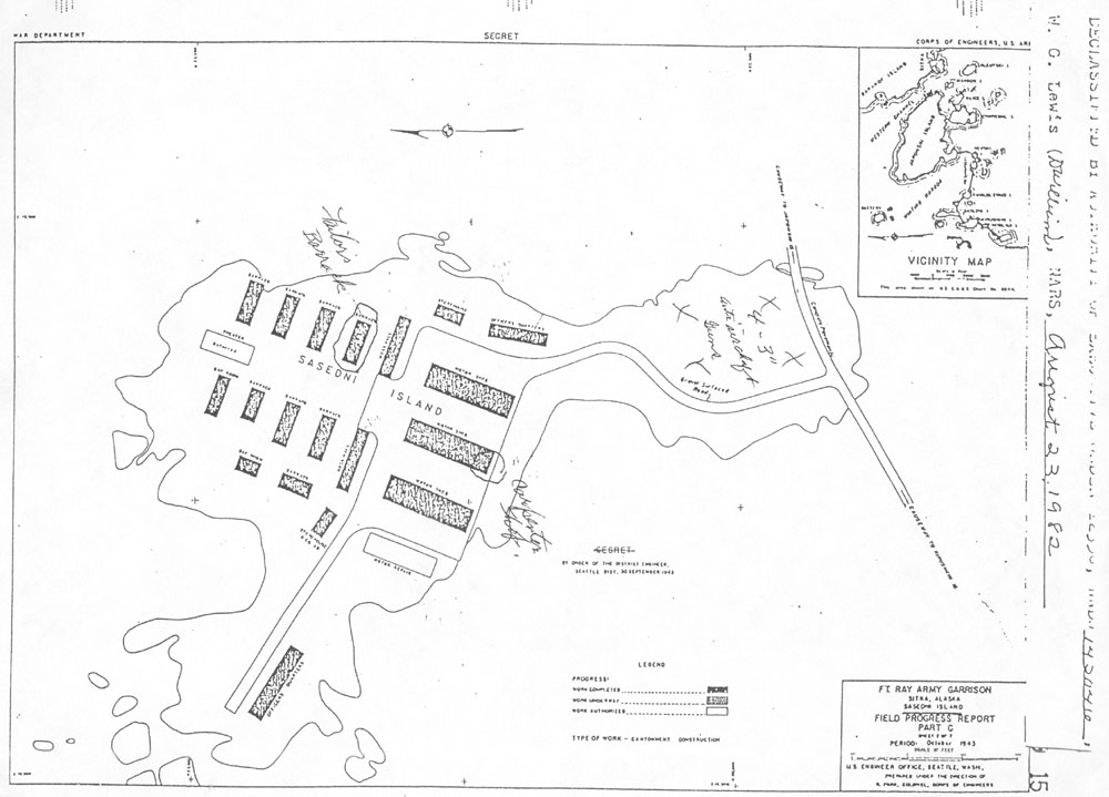 This Army document is a 1943 plot of the island showing all of the buildings on the island. The handwriting from John W. Failor, a member of the 205th CA. Mr. Failor built the 3-inch anti-aircraft gun positions. He marked the location of his barracks, the four guns emplacements, and the carpentry shop that the men created in the Motor Pool garage. |