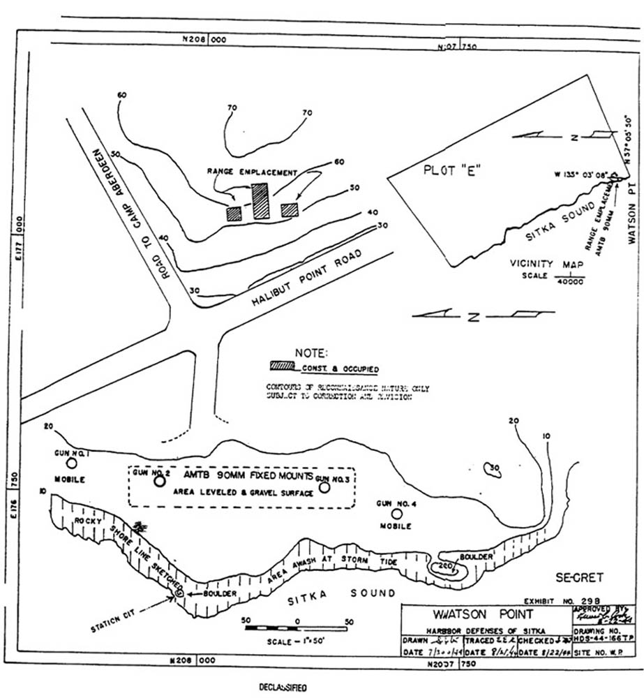 This document shows both AMTB batteries as constructed. The one in RED is Watson Point, AMTB battery No. 1. The 2nd battery was on Whale Island, and the Whale Island gun emplacements remain today. |
