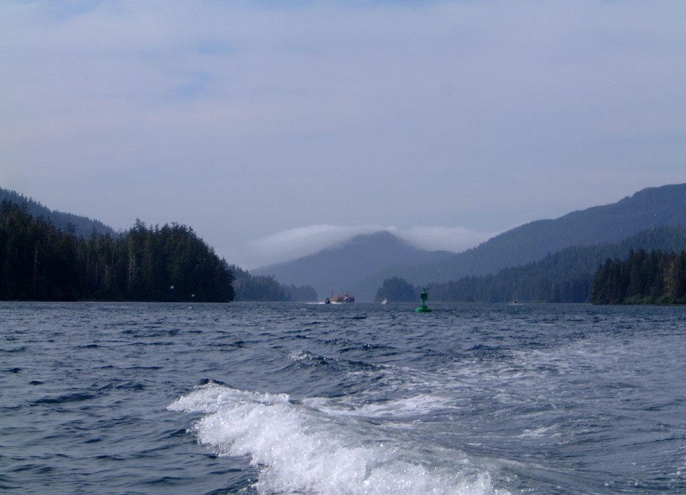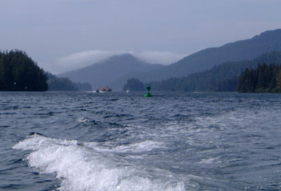 Highwater Island is just to the left of the green bouy. It is located near the northern end of Neva Straight. (June 2004)