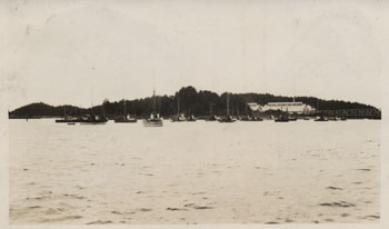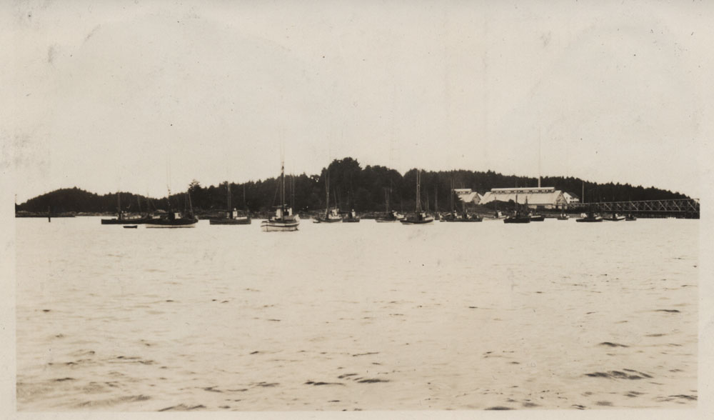 5448 - The Sitka fishing fleet lies at anchor in front of Japonski Island. Note the Navy coaling station. |