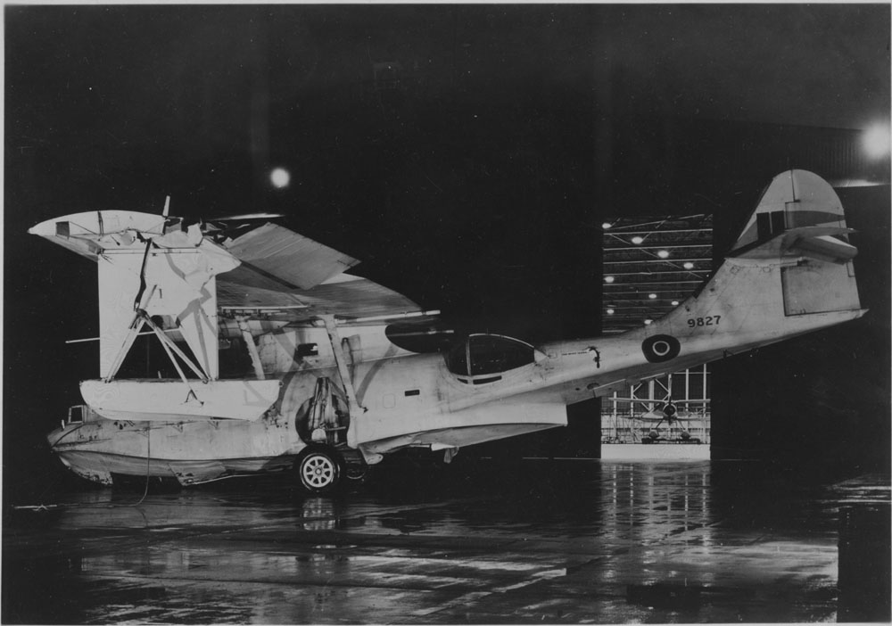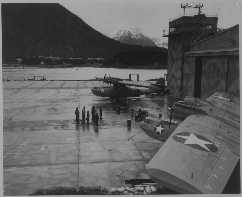3296 - Here the damaged RCAF PBY is in front of one of the NAS Sitka hangars. |