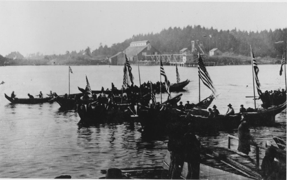 8617 - This view is probably from the 1920s or early 1930s. There are many Tlingit canoes, each with an American flag. The Navy Coaling station is in the background. |