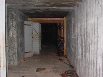 The front corridor of Battery 290, looking toward gun 2. The wooden doors at left lead to the powder room for gun 2. |